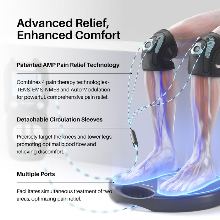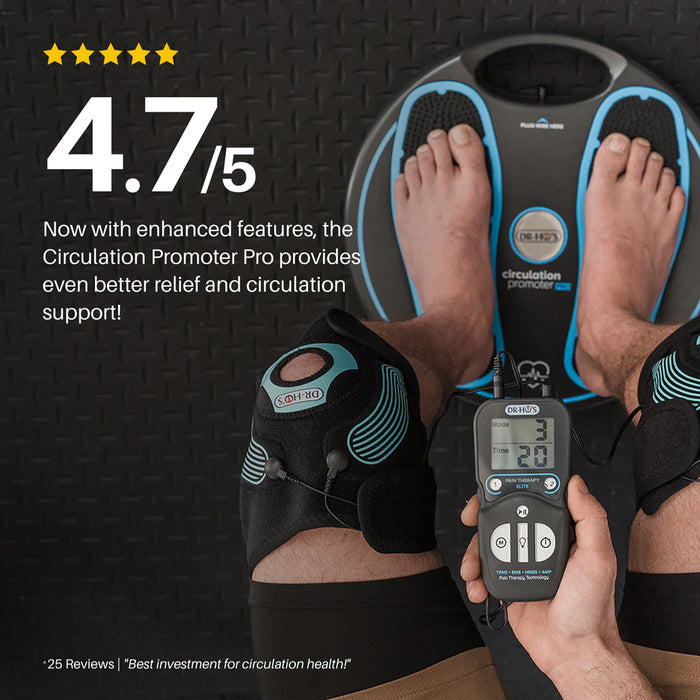 The Circulation Promoter Pro is our most advanced pain relief device, designed to relieve muscle, arthritis, neuropathy, and sciatica pain while increasing circulation and reducing swelling in the legs and feet. With AMP technology and TENS, EMS, and NMES therapy, this device treats two areas at once through dual independent ports, six therapeutic modes, and a programmable timer.