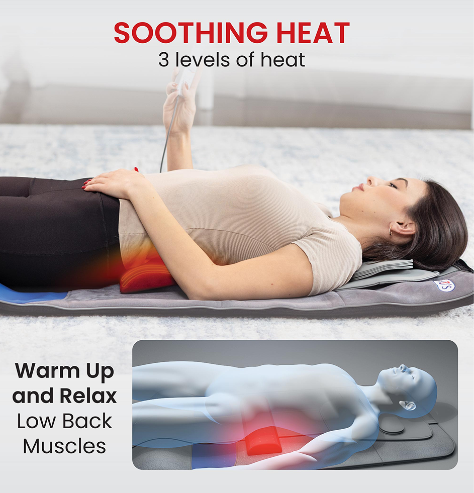 Unlike a heating pad, which only provides warmth, the Motion Solution Mat actively mobilizes the spine with 17 motion mobilizers that stretch, rotate, and elongate the back—similar to professional spinal therapy. Compared to massages, it offers consistent, repeatable motions and can be used daily at home for ongoing maintenance.